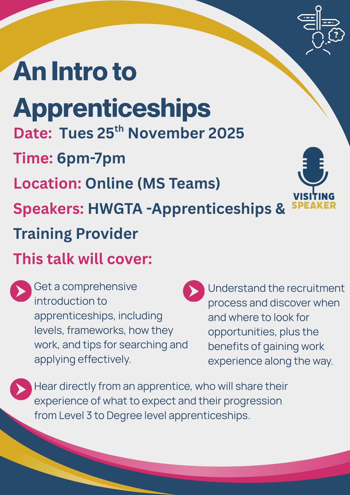 - Apprenticeships and Employment Pathway Talk – An Intro to Apprenticeships with HWGTA (Apprenticeship/ Training Provider): Tues 25th Nov 2025 6pm-7pm (online via MS Teams). Sign up via Impact Opportunities on Portal.