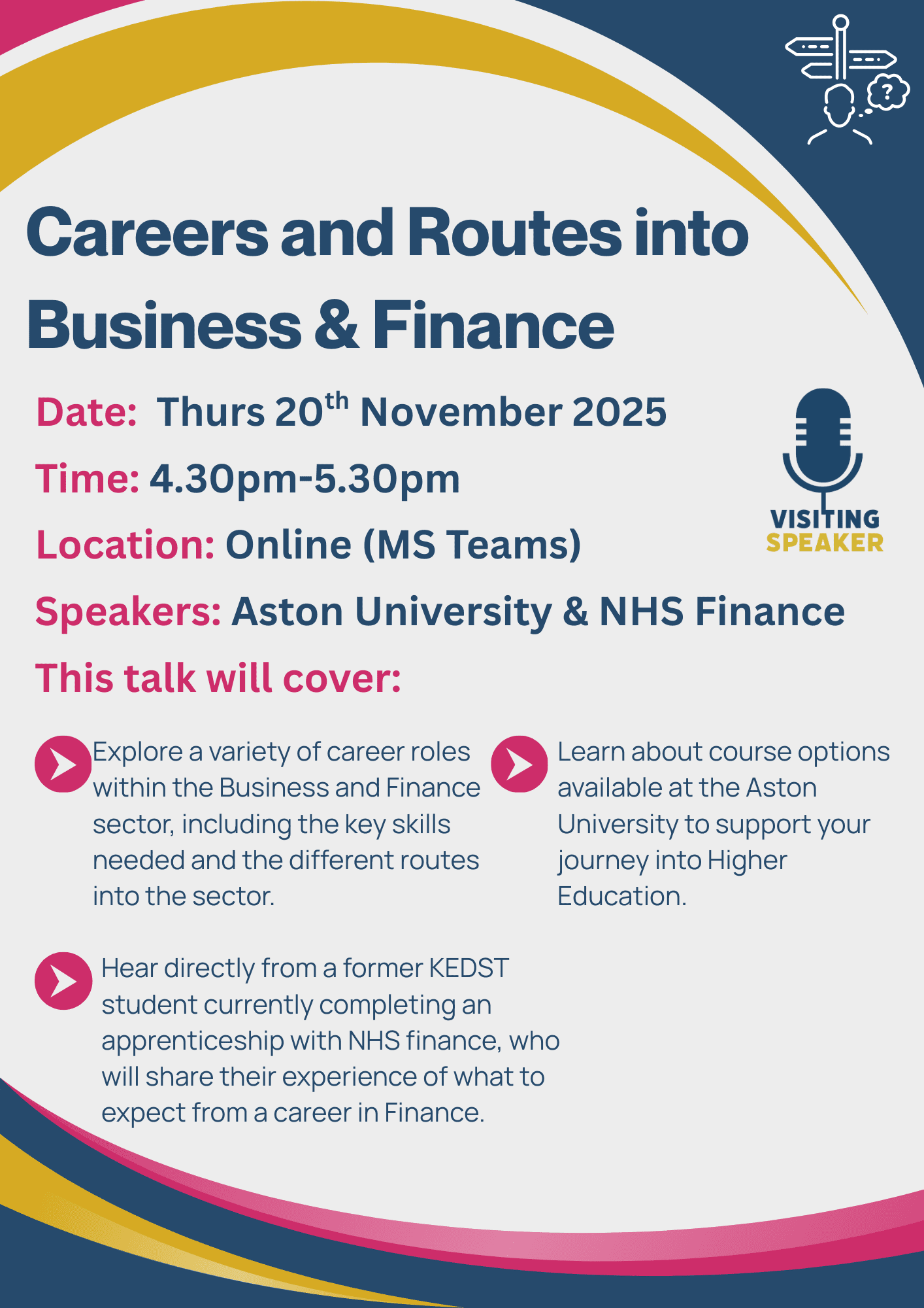 - Business and Finance Pathway Talk – Careers & Routes in Business & Finance with Aston Uni & NHS Finance: Thurs 20th Nov 2025 4.30pm-5.30pm (online via MS Teams). Sign up via Impact Opportunities on Portal.