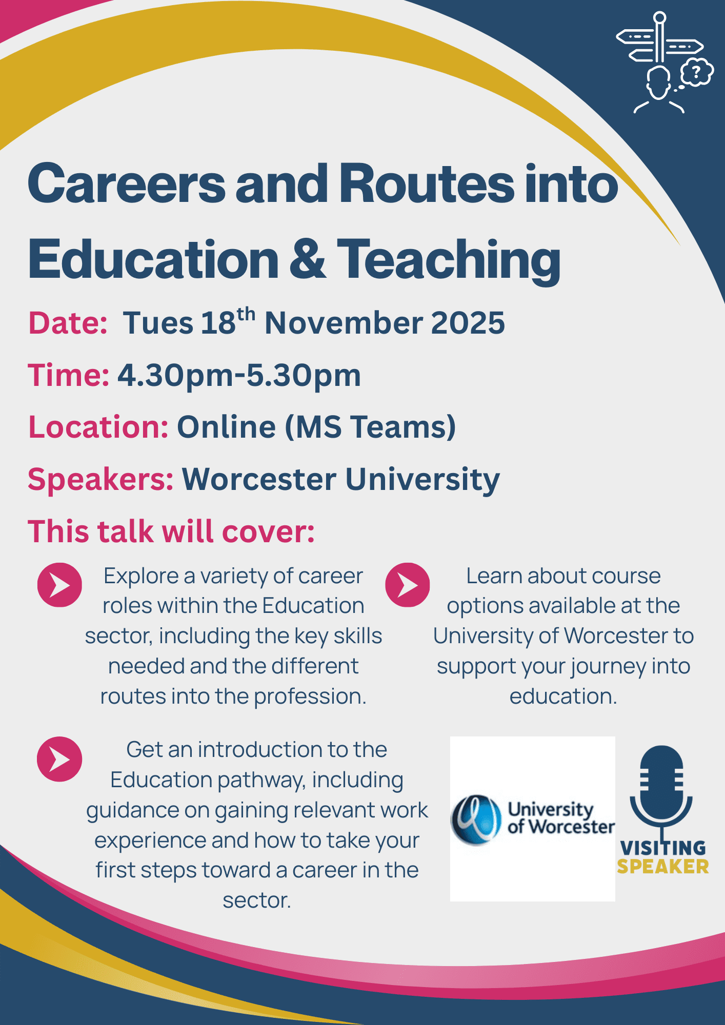 - Education Pathway Talk – Careers & Routes into Teaching & Education with Worcester Uni: Tues 18th Nov 2025 4.30pm-5.30pm (online via MS Teams). Sign up via Impact Opportunities on Portal.