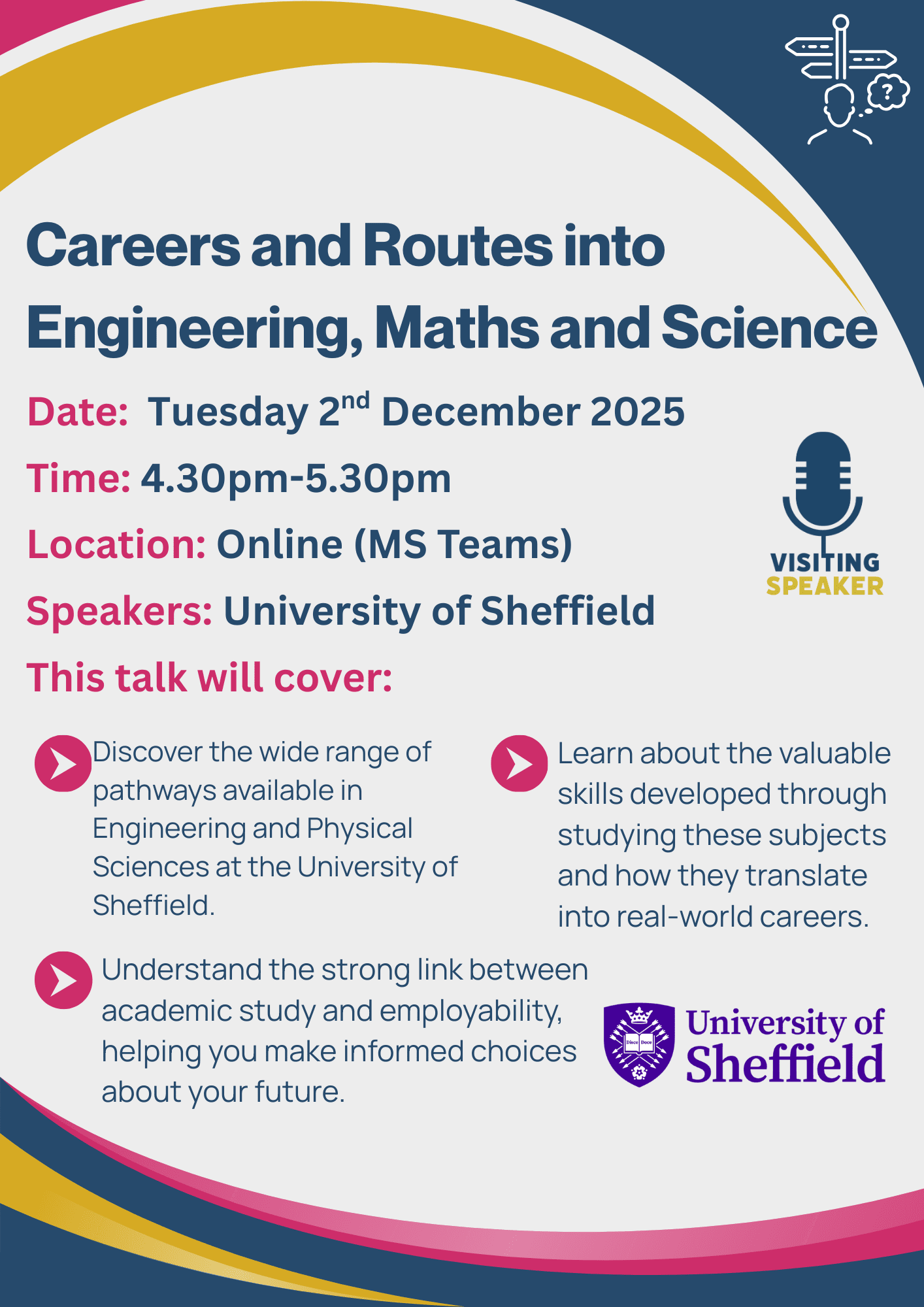 - Engineering, Maths and Science Pathway Talk – Careers and Routes into Engineering, Maths and Science with Sheffield University: Tues 2nd Dec 2025 4.30pm- 5.30pm (online via MS Teams). Sign up via Impact Opportunities on Portal.