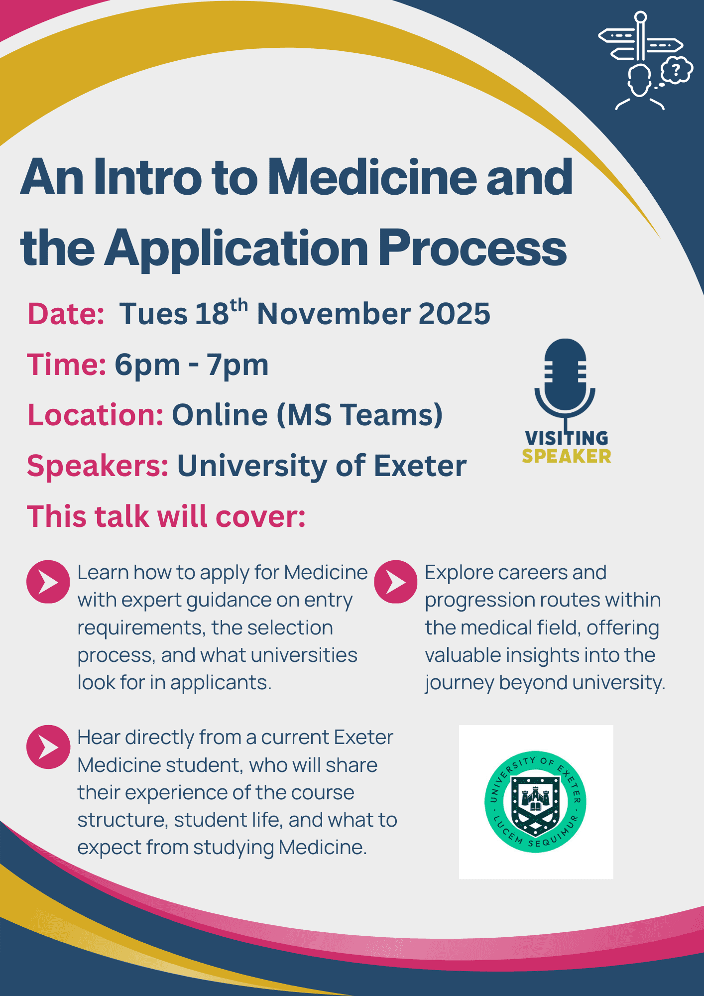 - Intro to Medicine and the Application Process with Exeter University: Tues 18th Nov 2025 6pm-7pm (online via MS Teams). Sign up via Impact Opportunities on Portal.