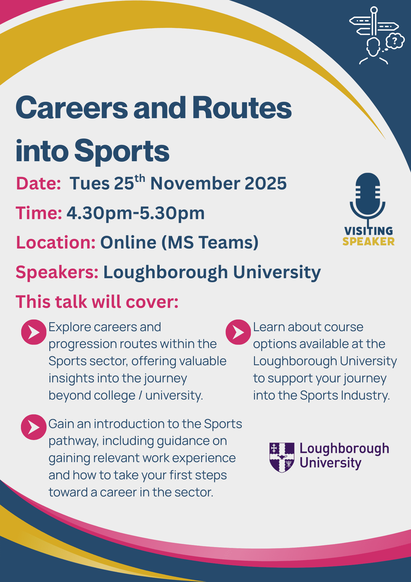 - Sports & Physical Performance Pathway Talk – Careers & Routes into Sports with Loughborough University: Tues 25th Nov 2025 4.30pm-5.30pm (online via MS Teams). Sign up via Impact Opportunities on Portal.