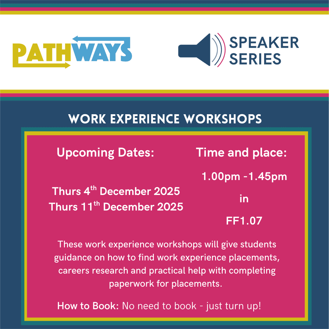 - Work Experience Workshop: Thurs 4th Dec 2025 1pm-1.45pm, FF1.07 – no need to book, just turn up!