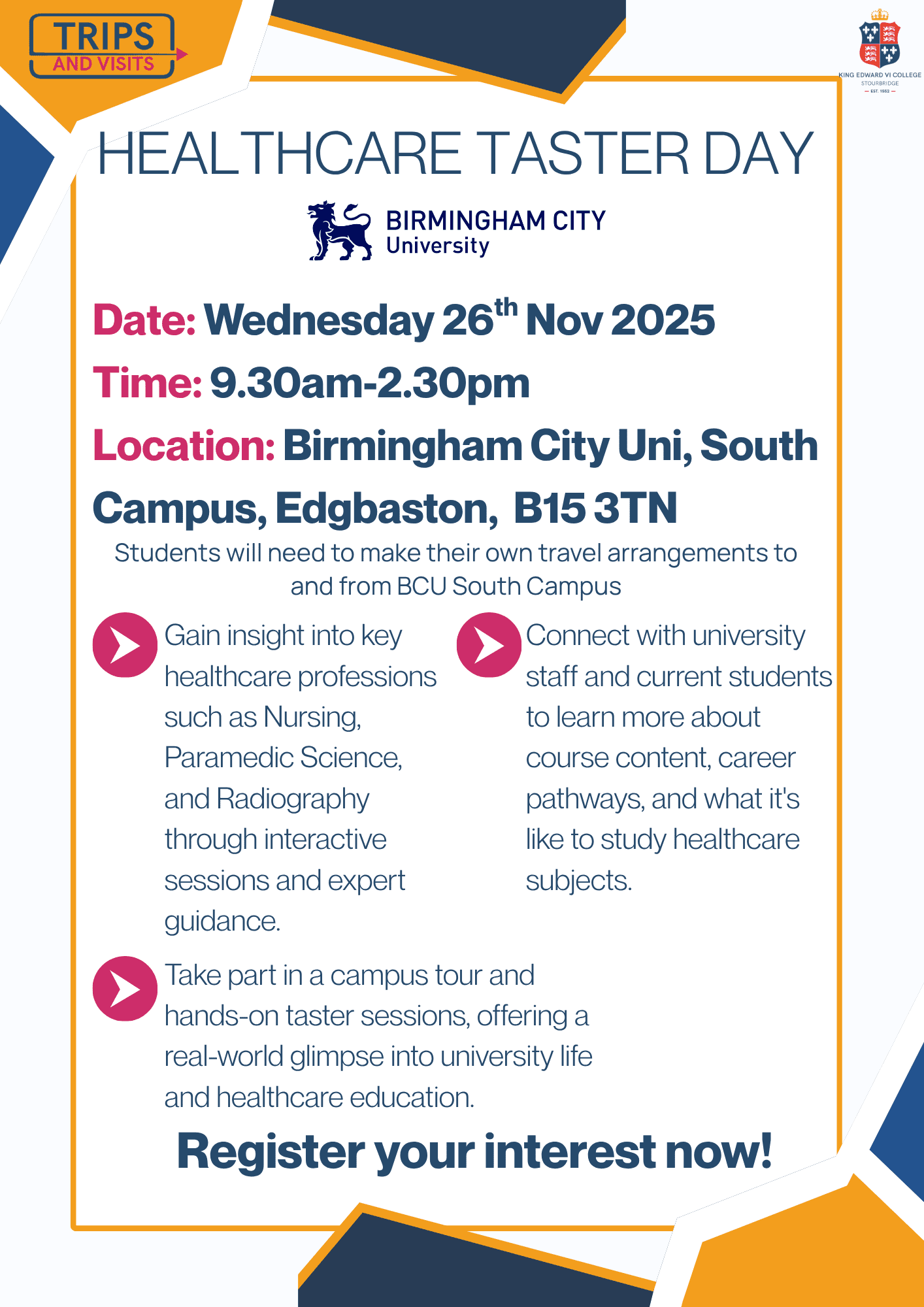 - Healthcare Insight Day with Birmingham City University (In- Person Work Experience): Wed 26th Nov 2025 9.30am-2.30pm. This exclusive opportunity for KEDST students to visit BCU to gain insight into key healthcare professions such as Nursing, Paramedic Science, and Radiography through interactive sessions and expert guidance. Places are limited. Students should register their interest via this link.